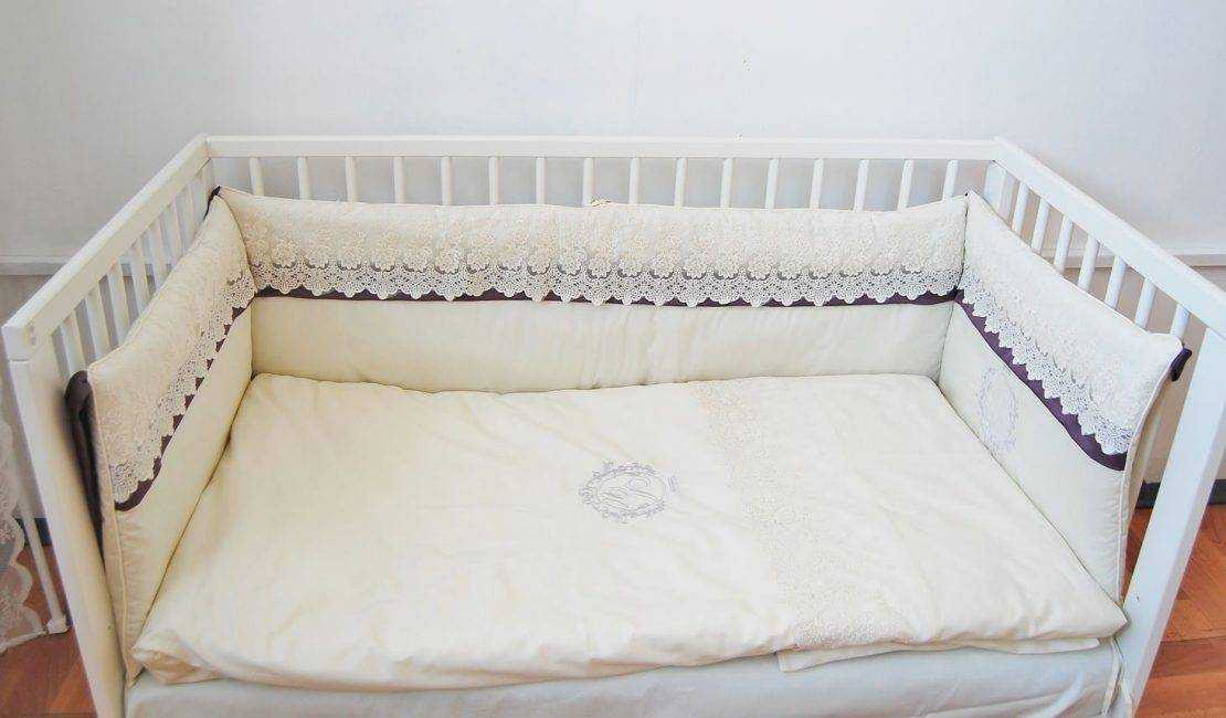 Некоторые постельные комплекты для новорожденных включают в себя еще и поролоновые бортики. Они станут полезными после 3 месячного возраста, когда малыш научится поворачиваться со спины на бок и с живота на спину. Бортики защитят головку ребенка от ударов об решетку кровати.