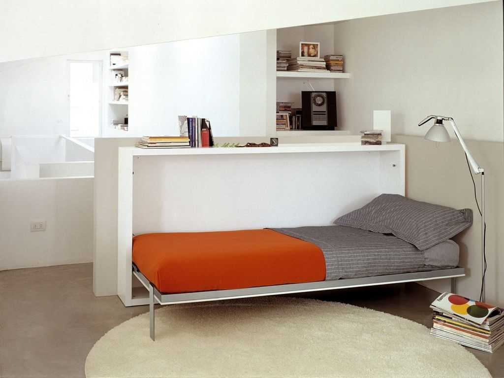 Мебель способную трансформироваться располагают у стены так, чтобы раскладывать кровать без препятствий.