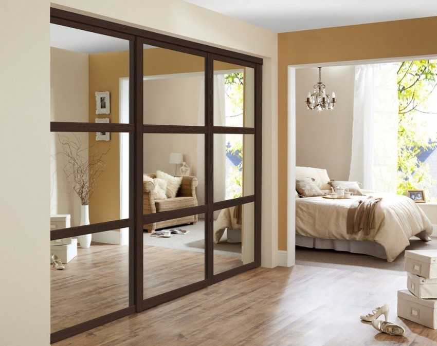 Чтобы обеспечить порядок в спальне, для хранения вещей отводится отдельная зона. Для маленькой комнаты подойдет шкаф-купе. Зеркало на передней дверце зрительно сделает комнату просторнее, за счет дополнительного отражения света.