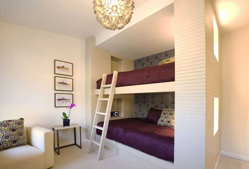 В комнате, где проживают маленькие девочки, можно сделать интересные ниши для кроваток. Для этого необходимо сделать красивые проемы в стене, выполненные в виде домиков с треугольными крышами, чтобы постели углубились идеально ровно. Украсьте внешнюю сторону проемов аккуратными резными деталями и дополните полупрозрачными занавесками, чтобы ниши можно было закрыть. Такие вещи будут смотреться интересно на фоне стены с фотообоями, изображающими природу.