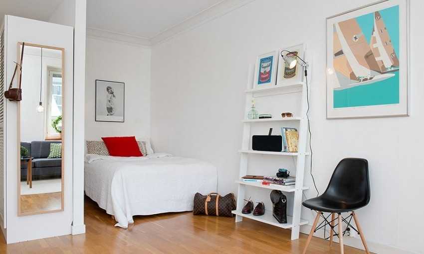 Гардеробная или спортивный уголок – очередные способы практичной эксплуатации ниши. В качестве разграничения зон интерьера однокомнатной квартиры иногда используют стеллажи.