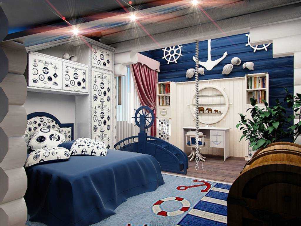 Морской стиль. Зачастую спальню в этом направлении оформляют для мальчиков. Разумеется, преобладающим в отделке будет синий цвет, «в компании» с ним хорошо смотрятся белый, красный, коричневый. Также должна присутствовать морская символика. Чтобы спальное место полностью соответствовало общей дизайнерской концепции, лучше, если оно будет выполнено в виде корабля или лодки.