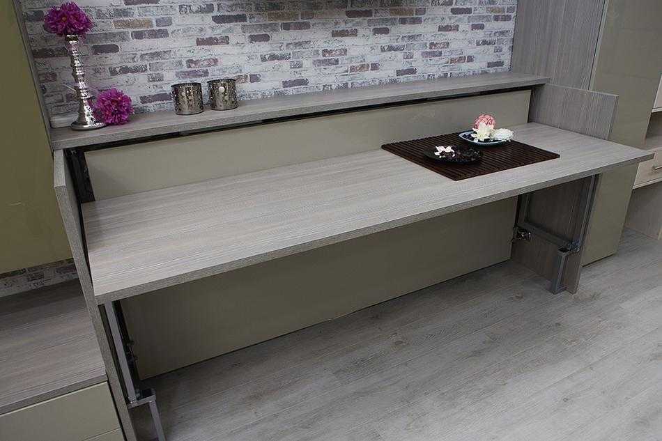 При необходимости (чаще всего это связано с численностью семьи) можно устанавливать вдоль стены не одну, а две откидные конструкции. Довольно редкий вариант, но имеющий право на жизнь — установка двух горизонтальных откидных конструкций друг над другом. Такая система в разложенном виде представляет собой двухъярусное сооружение.