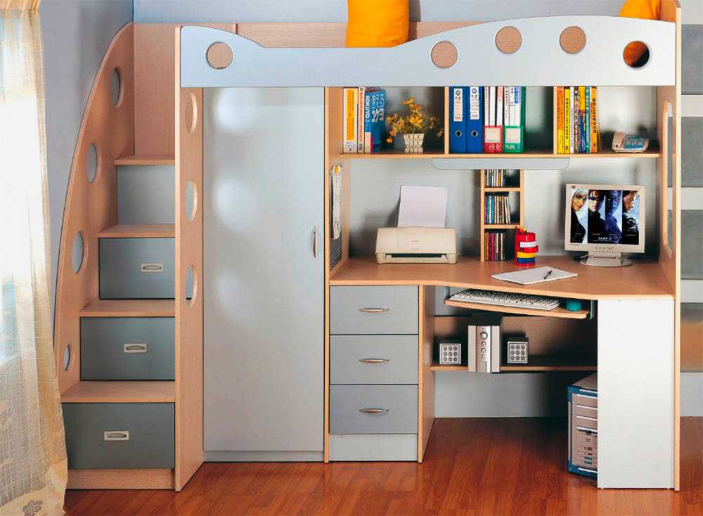 Существует огромное множество двухъярусных кроватей с компьютерными столами, а также всевозможными полками и шкафчиками. Они помогают организовать своего рода рабочий кабинет в очень ограниченном пространстве и заодно упорядочить вещи в комнате.