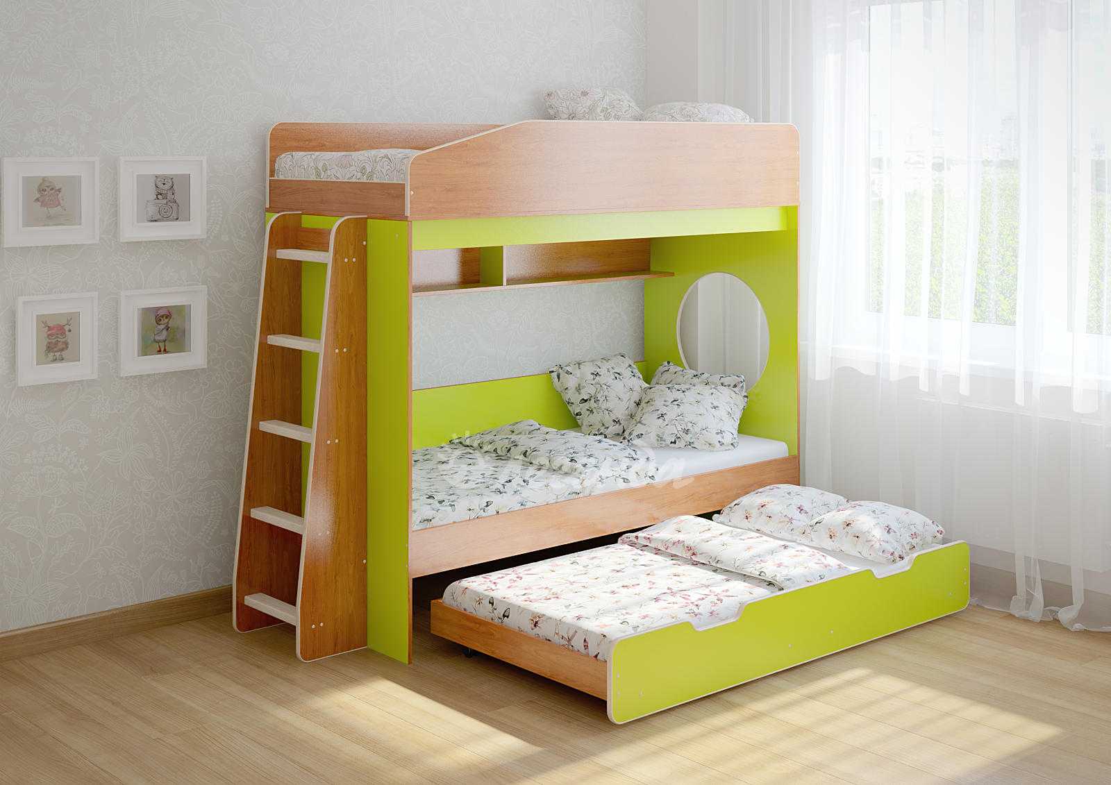 - Выдвижная конструкция из ярусов. Такая трехспальная кровать для детей представляет собой компактное изделие, где каждый ярус выдвигается вперед. Модель не занимает много места из-за того, что в сложенном виде ее высота остается неизменной;