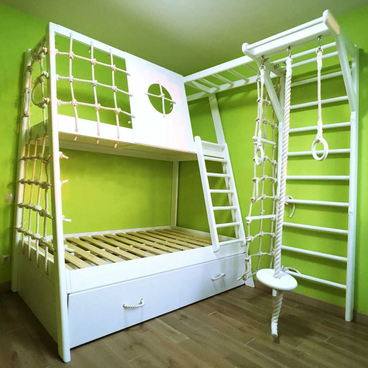 Двухъярусная кровать со спортивным комплексом или игровой зоной.