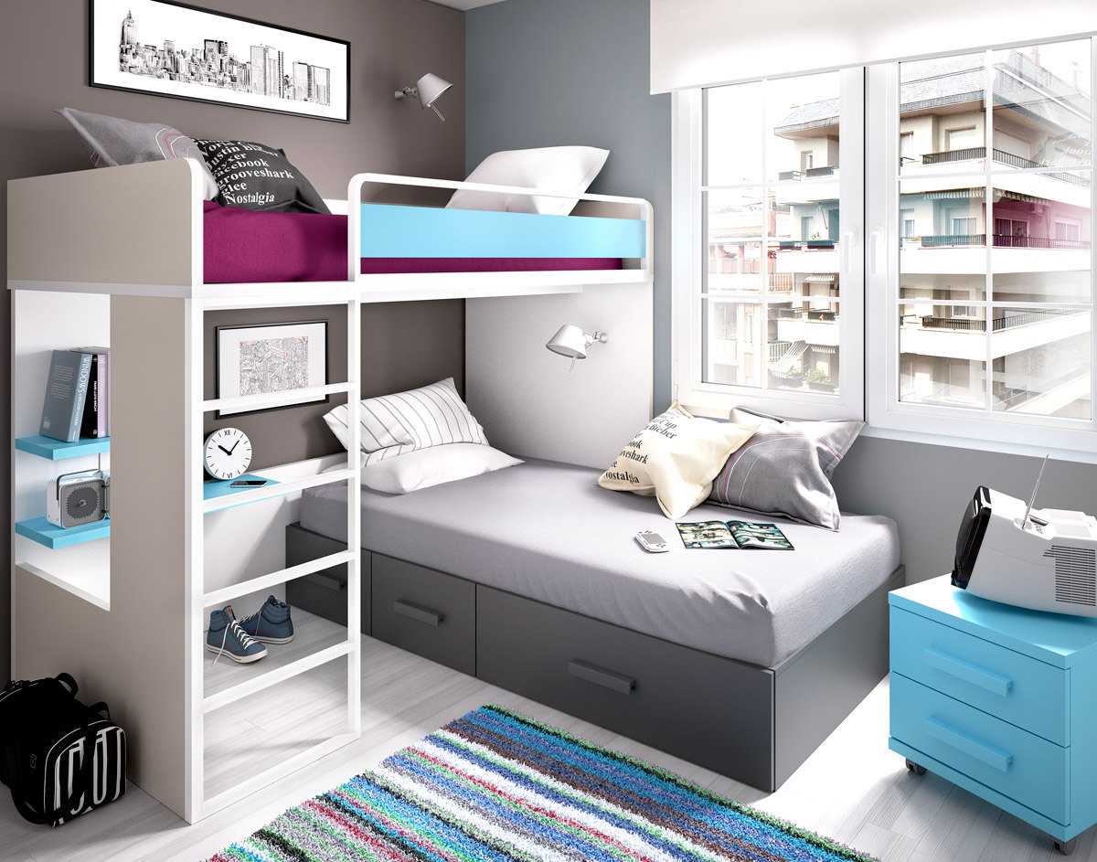 Главная задача в этом случае за счет поднятия места для сна при использовании двухъярусной кровати объединить ее со столом, расположив на первом ярусе рабочую зону. Иногда такие двухъярусные кровати бывают со встроенными ступеньками-ящиками, которые идеально подходят для хранения личных вещей ребенка.