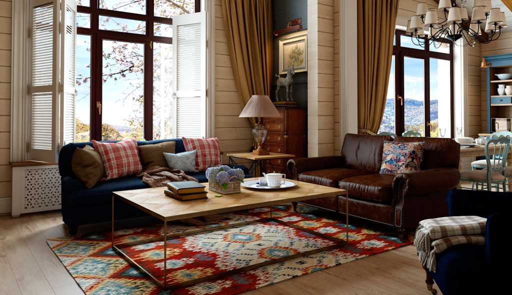 Чтобы стиль стал узнаваем важно наличие буфета, круглого стола, кресла-качалки. Основная мебель расставлена по всей комнате, а не у стен