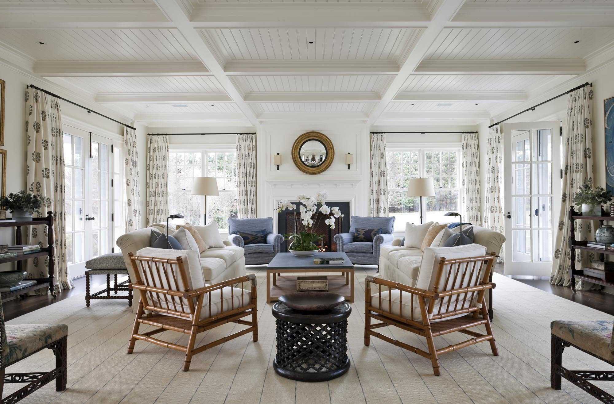 Потолок чаще всего невычурный, окрашивается в белый цвет. В других случаях изготавливают кессонную конструкцию из резного дерева, МДФ, пластика или гипсокартона, придающую помещению роскошный внешний вид. При создании интерьера в стиле кантри потолок декорируют массивными балками из натуральной древесины или их имитацией. Иногда потолочную поверхность или ее фрагменты оклеивают обоями.