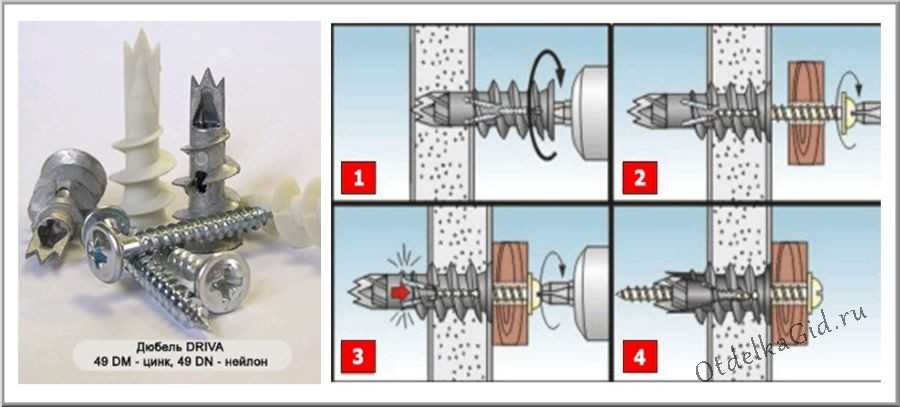 - Дюбель «Дрива», «Фишер». Дрива производится в двух видах: металл, пластик. Этот дюбель вкручивается в гипсокартонную поверхность так: