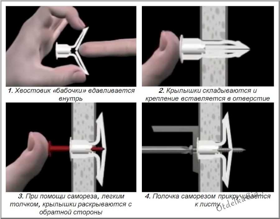 При креплении шкафов на так называемые “бабочки”, в стене необходимо сделать отверстия, и затем установить крепеж. При завинчивании самореза в “бабочку”, усики этого вида дюбеля расползаются в разные стороны и плотно прижимают установленное крепление к поверхности ГКЛ.