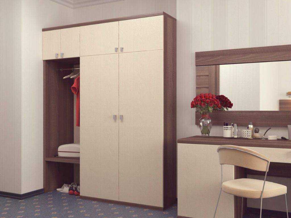 Комбинированная конструкция отлично подходит для того, чтобы хранить верхнюю одежду, обувь, сумки, зонты и другие аксессуары. Она оборудуется выдвижными ящиками и нишами, а также иногда оснащается дополнительной полочкой для ключей, перчаток и головных уборов.