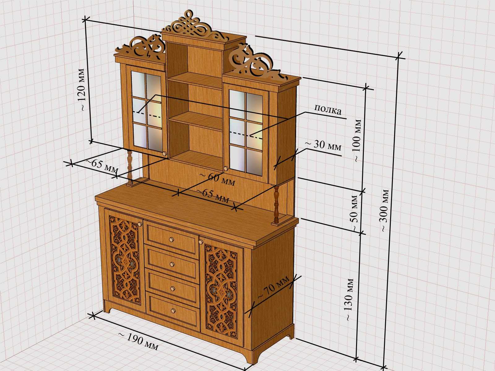 Чтобы самостоятельно изготовить мебель, нужно рассчитать размеры буфета, выбрать, из чего он будет сделан, и продумать дизайн.