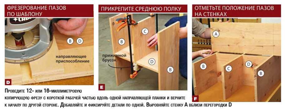 Для установки полок вырежьте фрезером пазы в боковых стенках и перегородке. Пазы заполните столярным клеем.