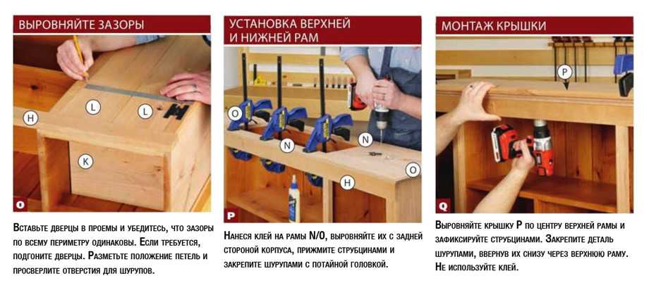Установите крышку и плиту основания шкафа, закрепив их саморезами.