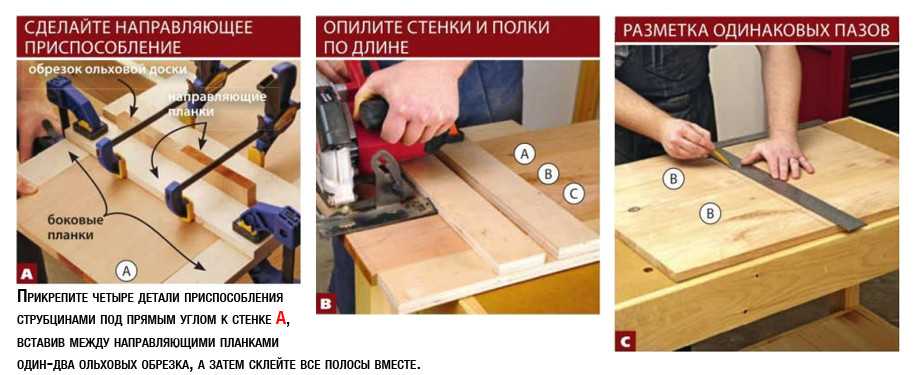 Выпилите из фанеры четыре полосы размерами 19x64x407 мм и соберите приспособление для фрезерования пазов (фото А)