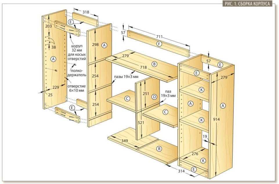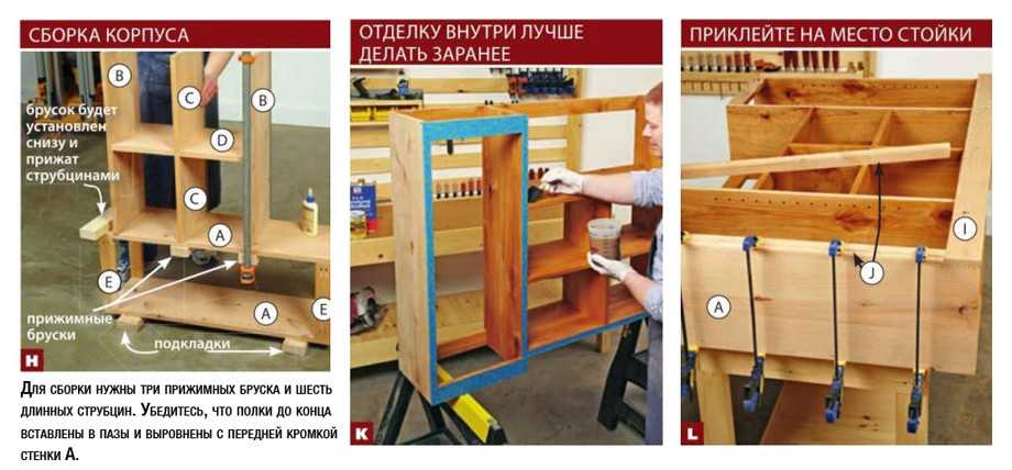 Вставьте в них полки и поперечные рёбра жёсткости. Стяните струбцинами детали мебели в единый корпус.
