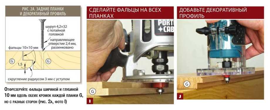 2. Отфрезеруйте фальцы шириной и глубиной 10 мм вдоль обеих кромок каждой планки G, но с разных сторон (рис. 2а, фото I), чтобы гребень одной планки перекрывал фальц следующей. Затем на внутренней стороне каждой планки отфрезеруйте 3-миллиметровое скругление с уступом (так называемый «ноготок») (рис. 2а и фото J). Окончательно отшлифуйте внутренние стороны всех планок наждачной бумагой № 220.