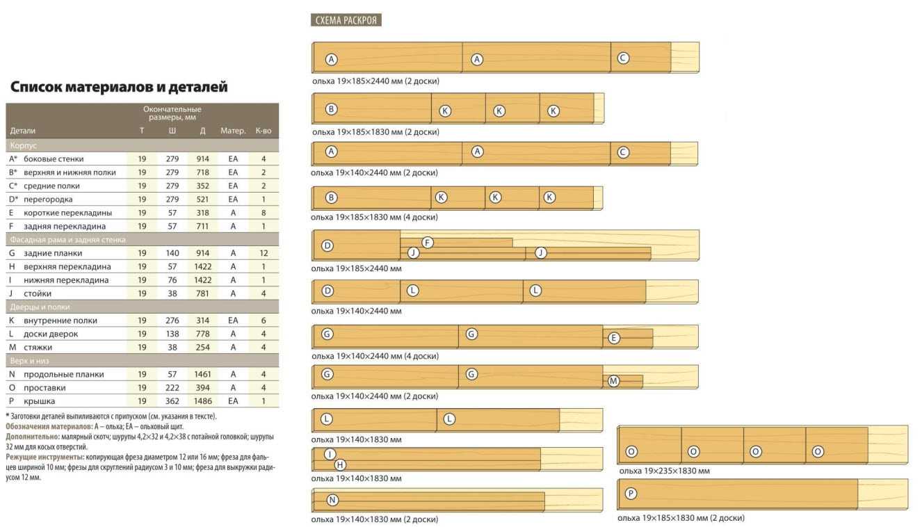 Из материалов нужны будут ольховые доски. В связи с тем, что найти доски шире 150 мм сложно, мы будем изготавливать самодельные мебельные щиты посредством склейки. Полная спецификация отражена на рисунке.