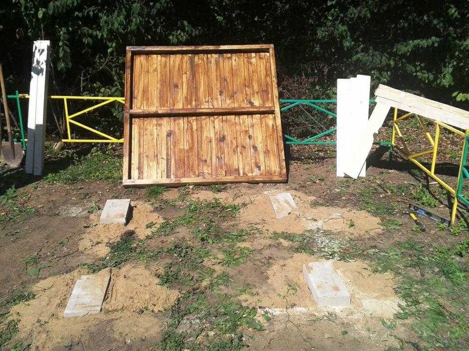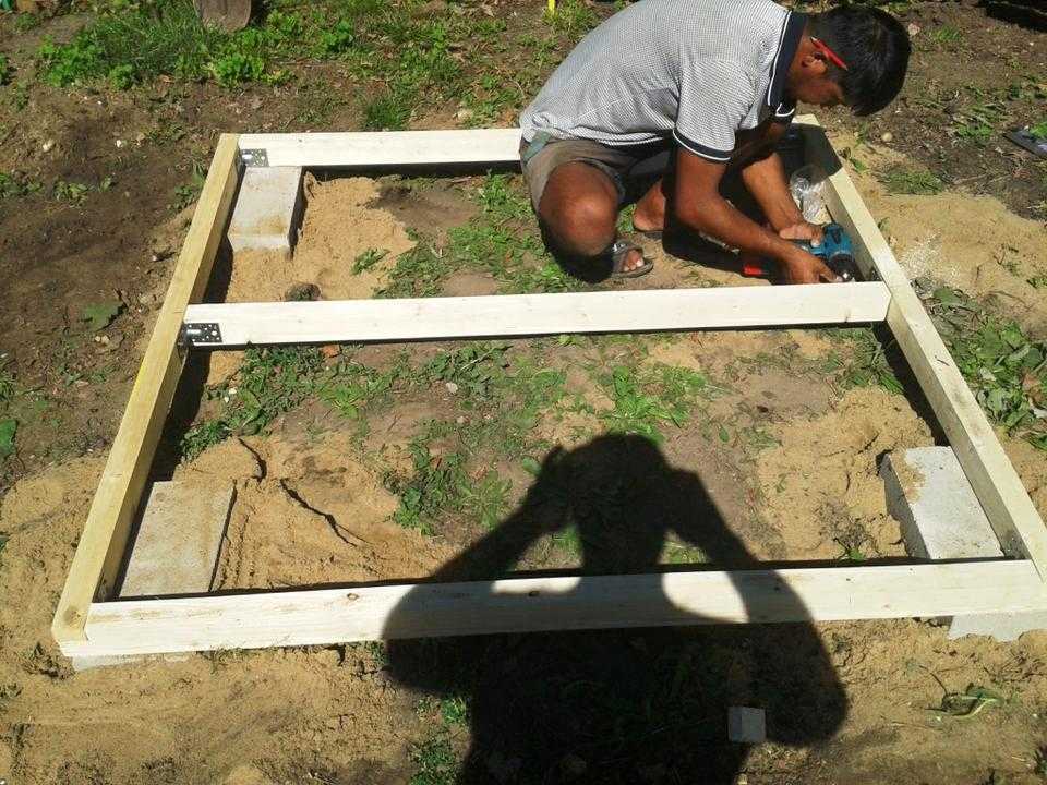 Каркас укладывается на 4 фундаментных блока, которые заранее устанавливаются на глубине в 1 штык лопаты по уровню песчаной постели. Необходимо проложить слой гидроизоляции между фундаментом и каркасом.