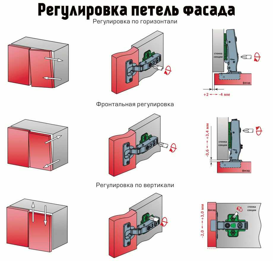 Но не стоит расстраиваться, если приобретенный вами механизм оказался не регулируемым. В этом случае вопрос решается путем тонкой регулировки мебельных петель, ведь стандартные петли имеют возможность подстройки в 3 плоскостях. На схеме ниже показаны регулировочные винты.