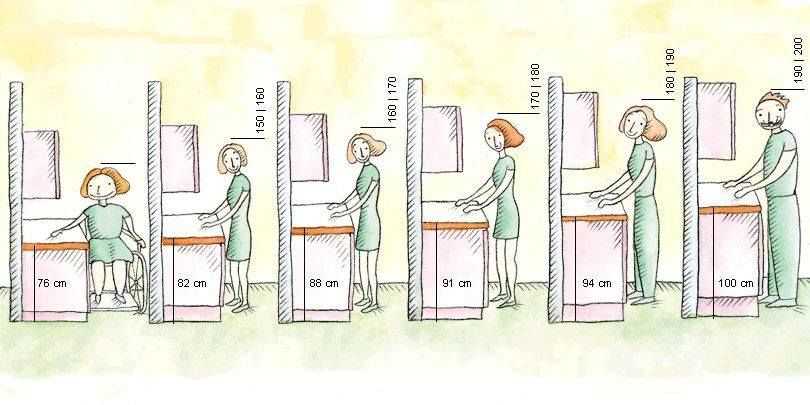 Средний рост всех членов семьи целесообразно учитывать, если на кухне готовят периодически каждый из них. Если готовит кто-то один, то достаточно за основу отсчета взять его рост. Для людей среднего роста оптимальным является расположение навесной мебели на высоте 140-150 см.