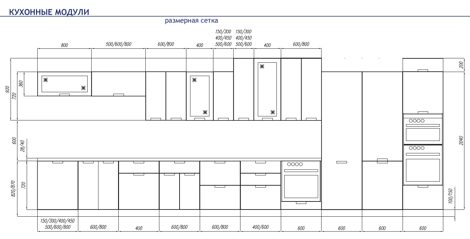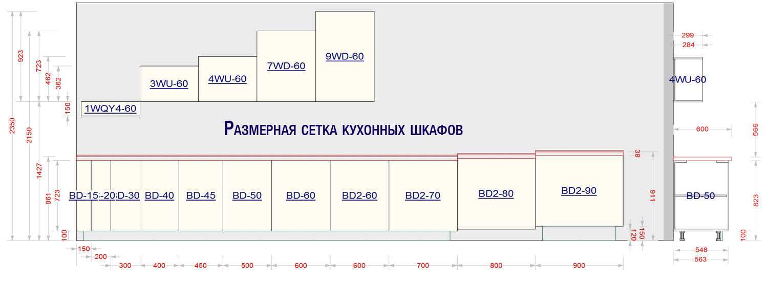 Стандартные габариты кухонной мебели выглядят следующим образом: