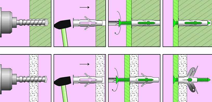 Такие способы навески тяжёлых предметов довольно надёжные и просты в использовании. В зависимости от ситуации применяют такие метизы: дюбель — зонты, бабочки или моль.