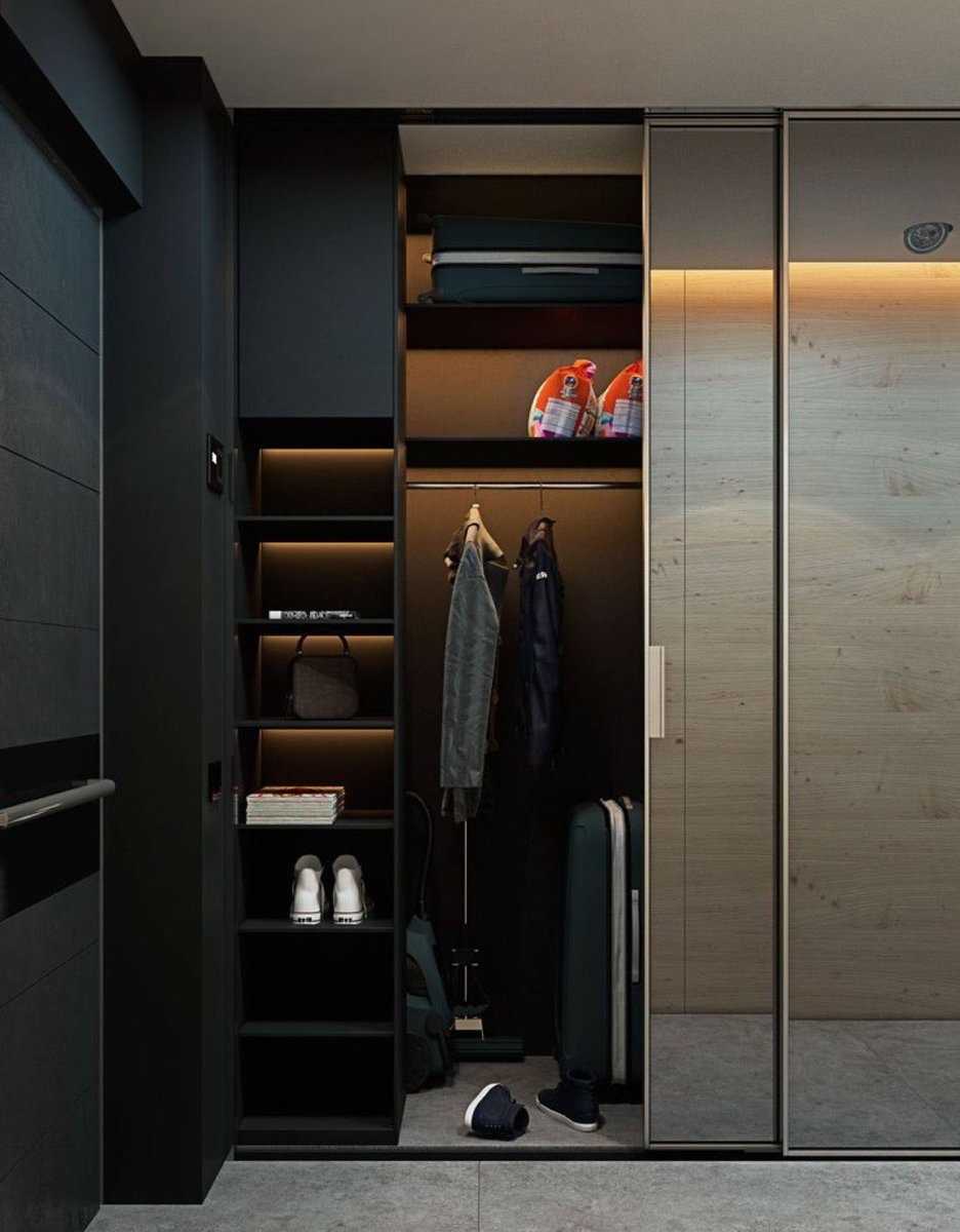 Важным условием создания гардероба в этом стиле является наличие прочных стен, т. к. вся нагрузка будет приходится именно на них. В данной конструкции нет боковых полок и панелей, и все составляющие крепятся именно к стене. Если наполнить гардеробную корпусной мебелью, то это будет напоминать большой шкаф, только без дверей. Часто используется выдвижной шкафчик в роли основного элемента. Минусом данного стиля является достаточно крупные габариты каркаса. Панели и металлопрофиль — очень простая и легкая в сборке конструкция. Металлопрофиль задает форму и размеры, а затем обшивается панелями из любого крепкого материала, в том числе и гипсокартона.