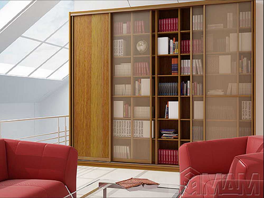- книжный шкаф купе представляет собой стеллаж, который спереди закрыт раздвижными дверями, как в купе. Он бывает либо встроенным, либо с задней стенкой. Такой купейный книжный шкаф закроет всё пространство от пола до потолка;