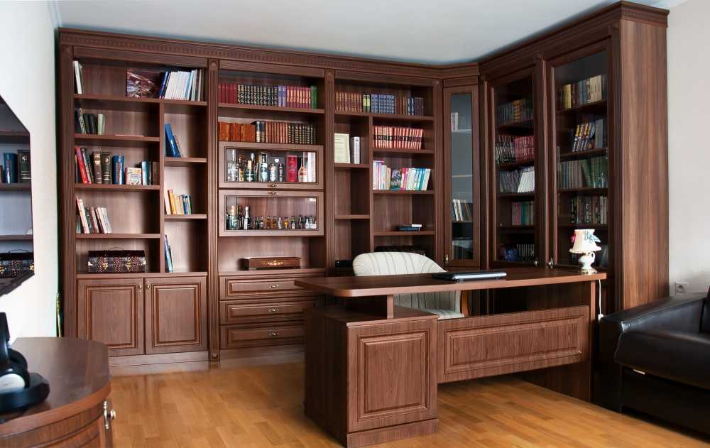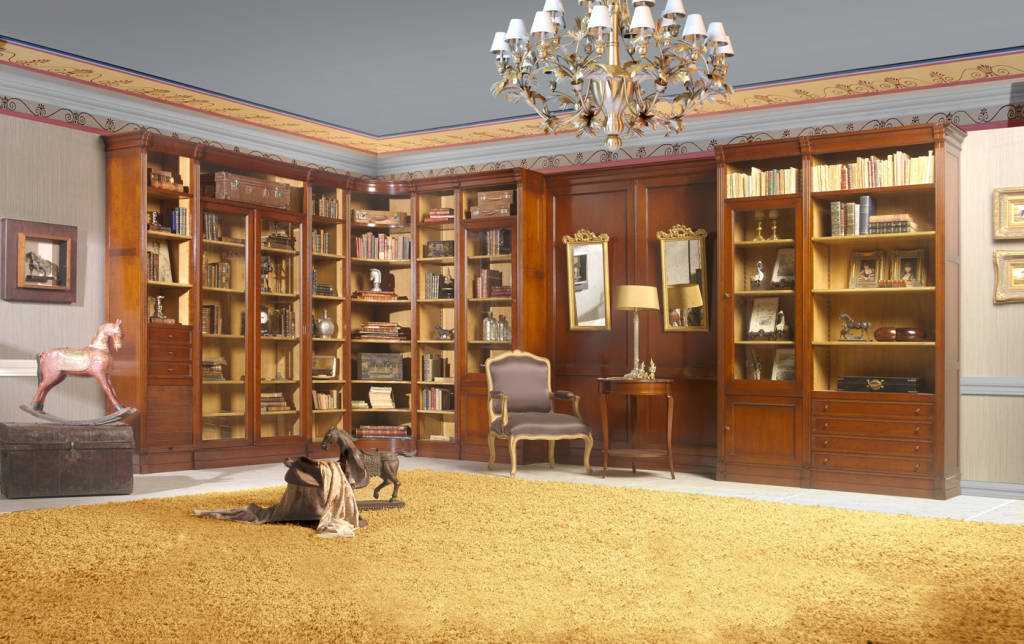 Классика размещения книжных шкафов и стеллажей. Тематика литературы, размещённой в подобном помещении, должна быть серьёзной – это подчеркнёт статус хозяина дома. В то же время, издания, расставленные вдоль одной из стен дома или в угловых книжных шкафах библиотеки, добавят уюта без излишней «показухи». Для подобных помещений обычно приобретаются стеллажи из более дорогих материалов. Чаще всего, это книжные шкафы для домашней библиотеки из массива.