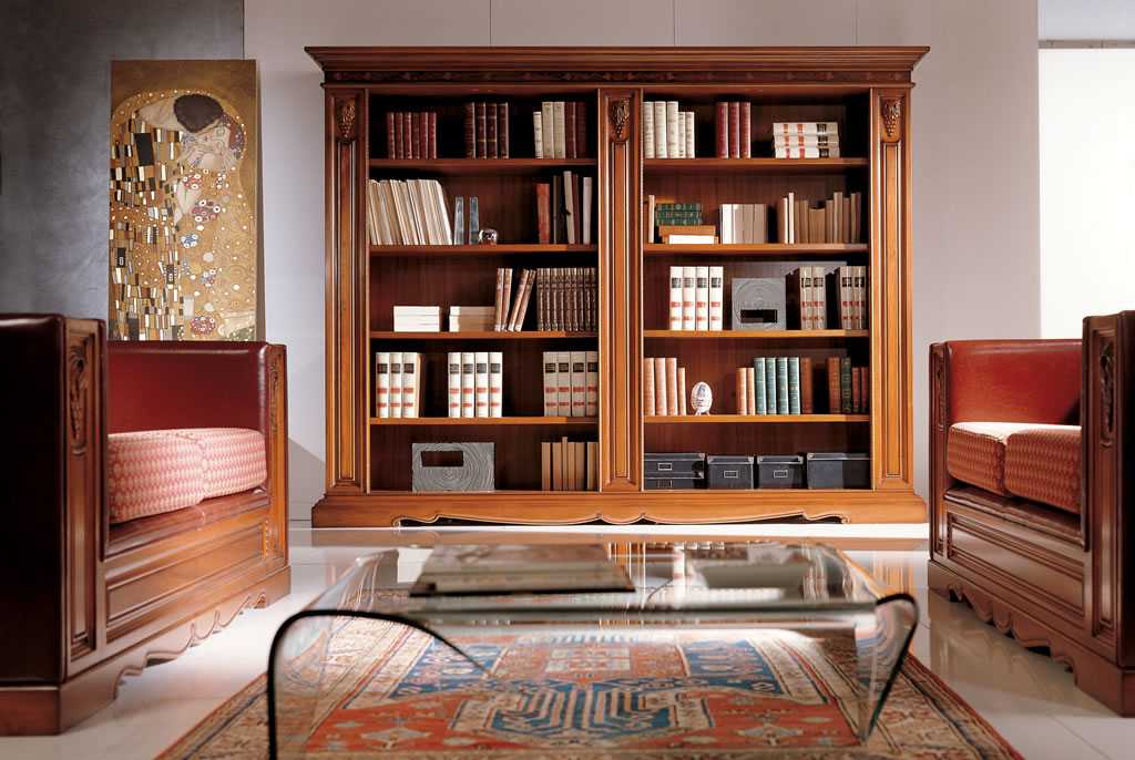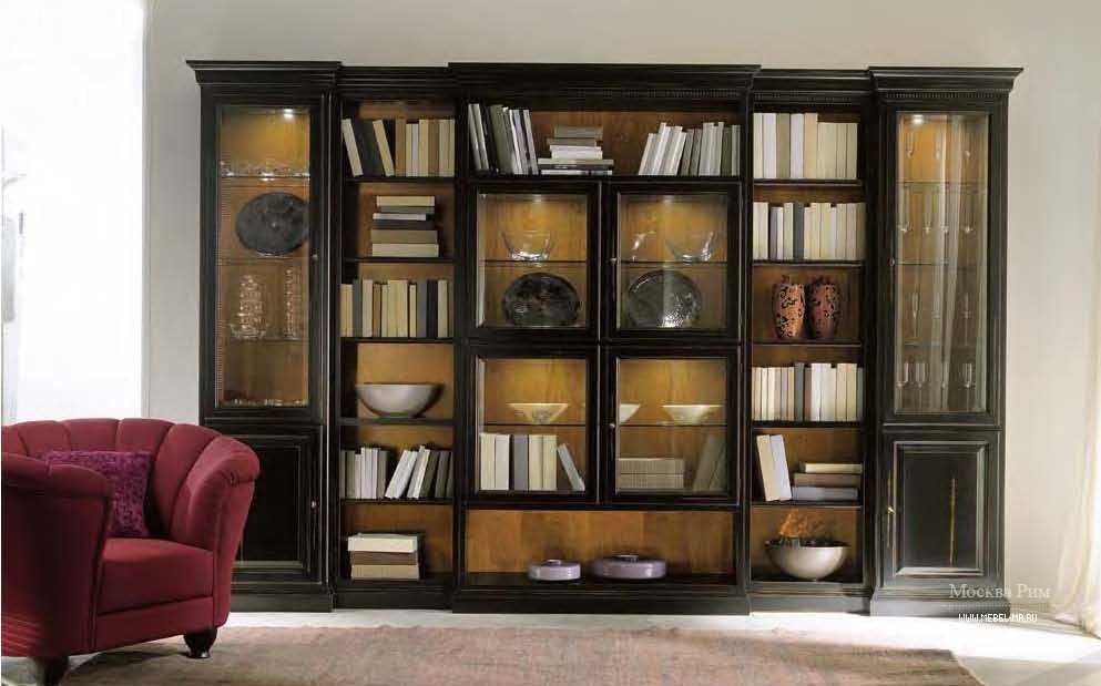 - традиционный — классический книжный шкаф, оснащенный распашными или раздвижными дверями, застекленными вверху и глухими внизу. Он закрыт, в нём очень хорошо сохраняются книги, они не накапливают пыль;