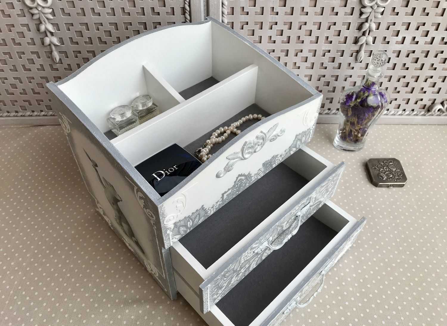 Компактные современные бьюти боксы для бижутерии, офисные органайзеры для канцелярской мелочевки и универсальные контейнеры для рукоделия можно изготовить из подручного материала самостоятельно. Мини комод своими руками конструируется как из фанерных заготовок, так и из плотных картонных коробочек или пластиковых упаковок от аптечной продукции. Профессиональные мастер классы по домашнему рукоделию сориентируют, как украсить полезный комод при помощи декупажа или специальных декоративных наклеек.