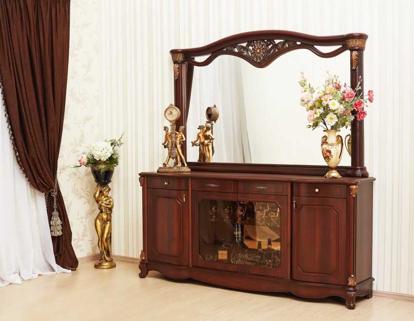 - для гостиной: украшенная особым декором, роскошными инкрустациями и резной отделкой – классический стиль; дополненная современными электронными устройствами, выдвижной столешницей с телевизионным экраном – для сторонников стиля хай-тек;