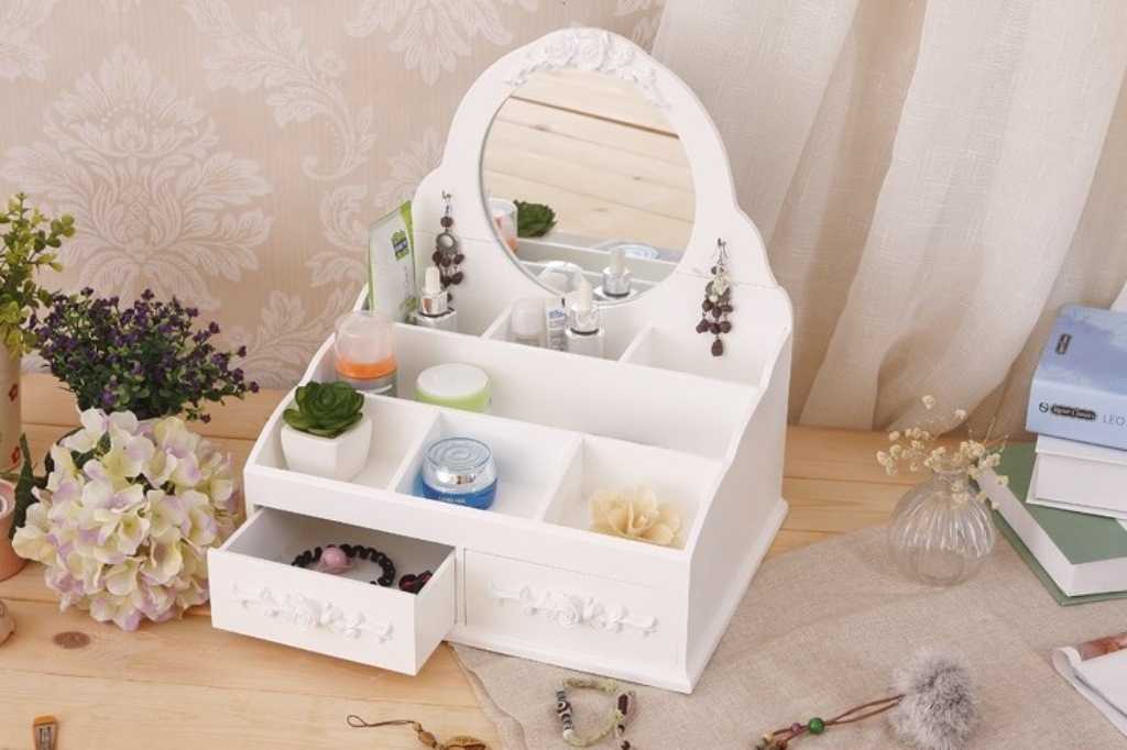 Главное назначение и преимущество комодика состоит в наличии большого числа открытых и закрытых полок, ящичков, отсеков и добавочных компонентов, на которых можно правильно и плотно расположить украшения, средства для ухода и декоративную косметику.