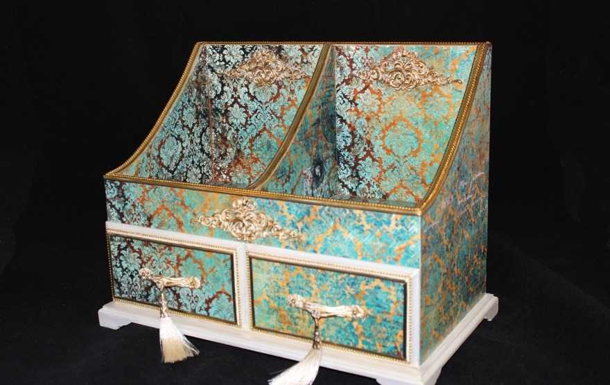 Интересно то, что изящные вычурные ларцы – комоды имели применение в домашнем быту царской семьи. В Крыму в музее Ливадийского дворца в покоях царевны Ольги Николаевны на туалетном столике и в наше время стоит антикварный шкафчик – поставец (переносной). За зеркальной дверцей установлены полки для хрустальных флаконов и повседневных туалетных принадлежностей, а нижняя часть выполнена из классических деревянных выдвижных коробочек.
