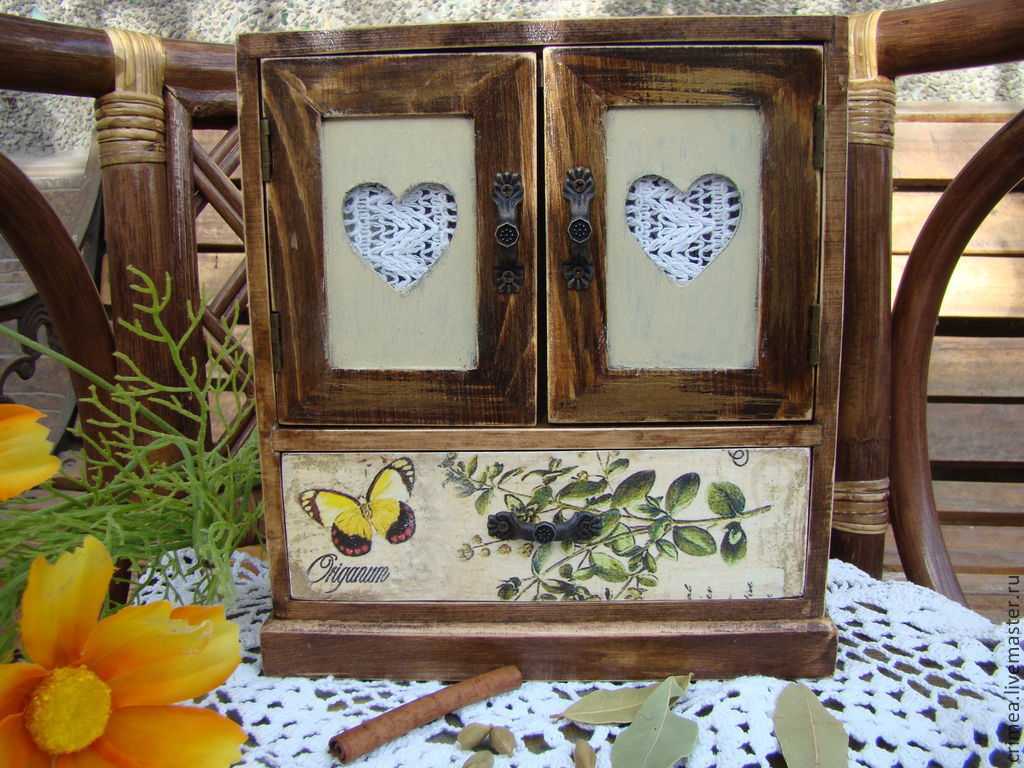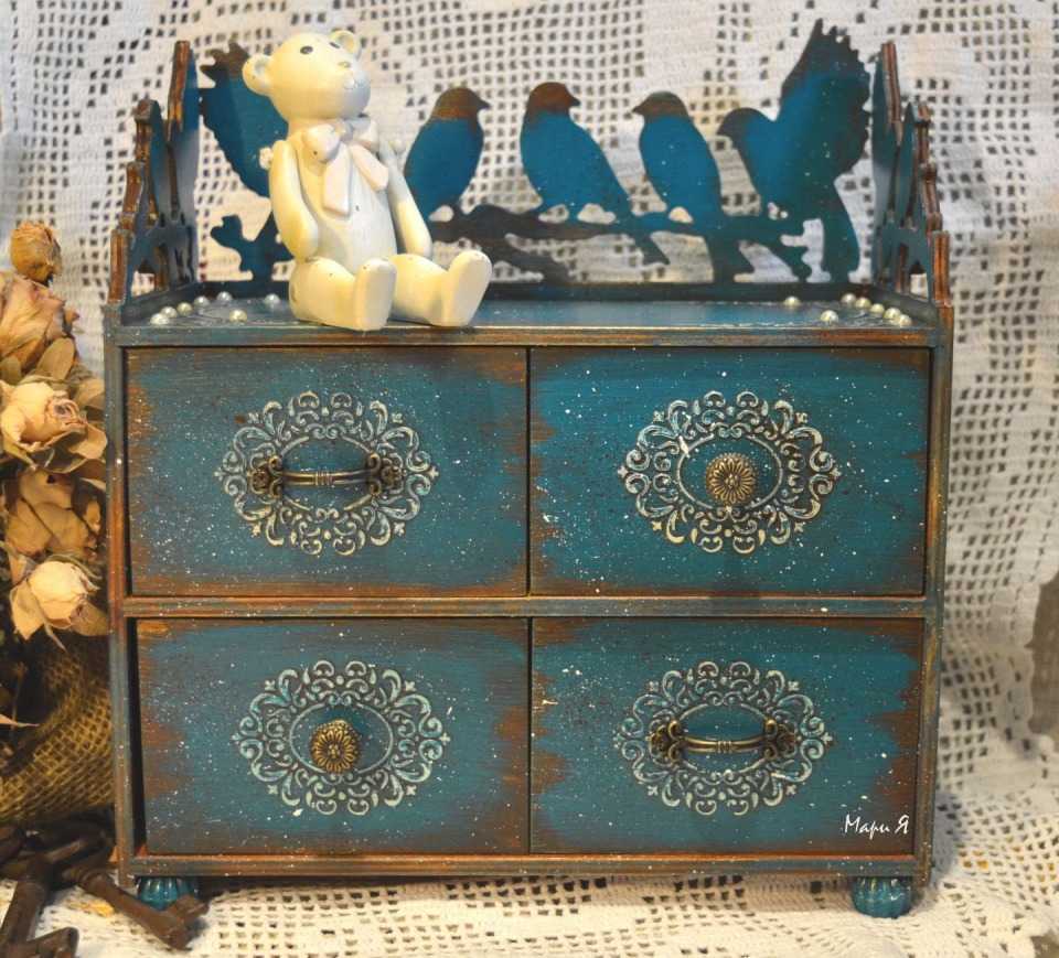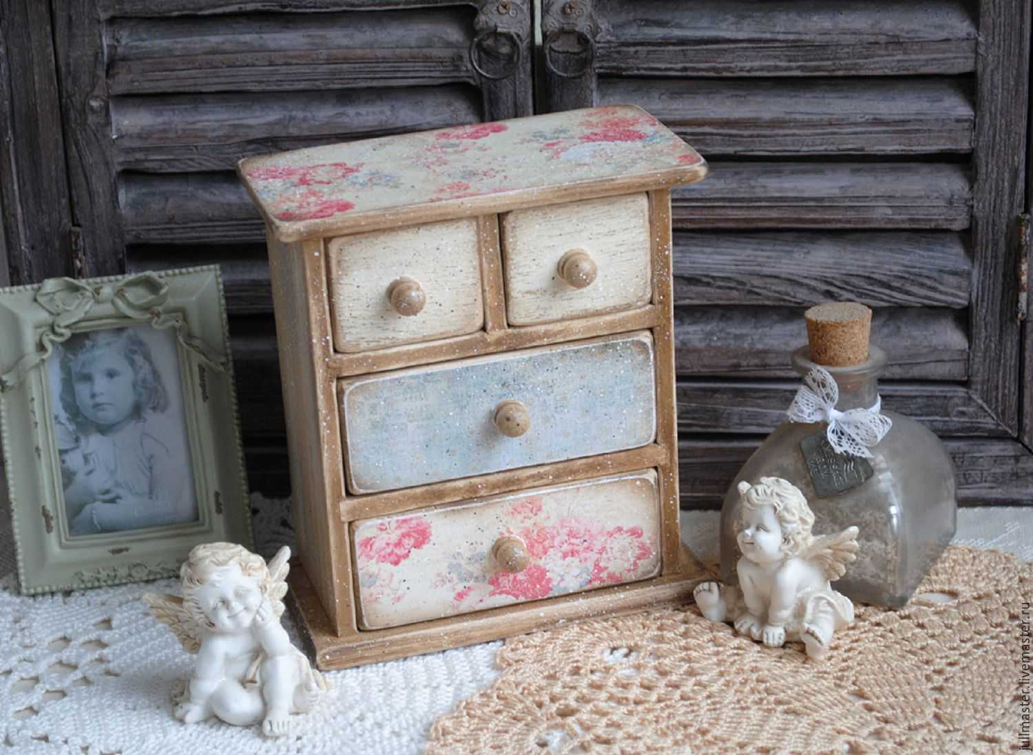 Украсить мини-комод можно в технике декупаж: рисунок с салфетки перенести на изделие с помощью воды, кисточки и клея.