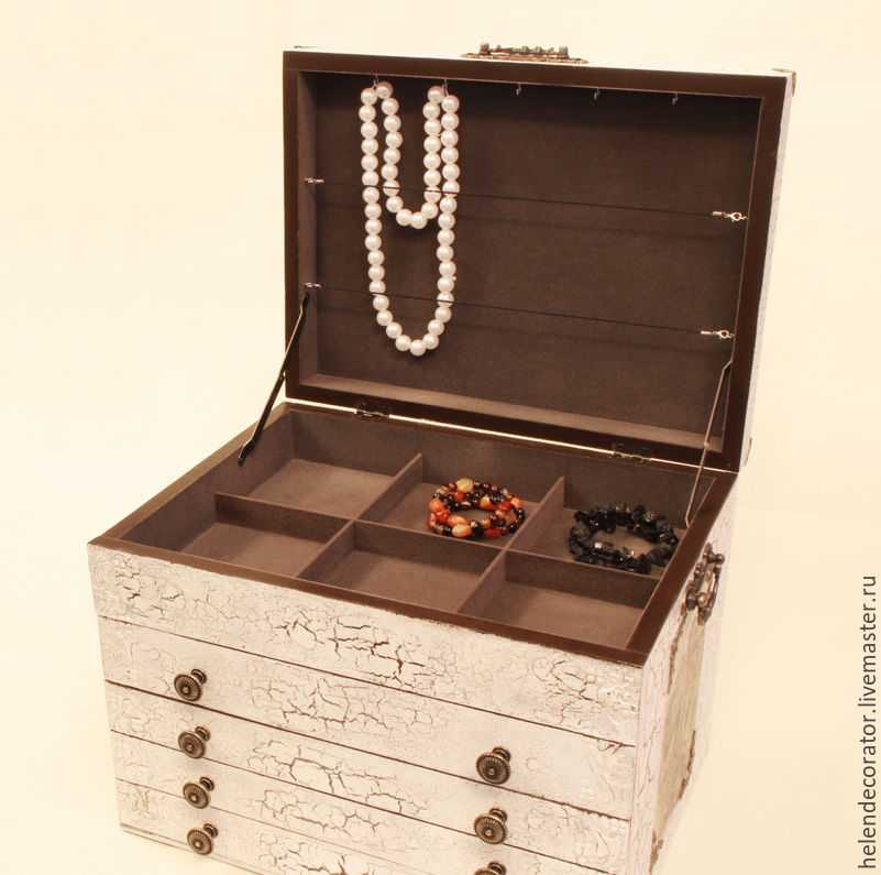 Для хранения «скромных» повседневных украшений использовались ювелирные кабинеты – ларцы, обитые изнутри алой тафтой (тканью с благородным отливом) и оборудованные потайными ящичками, секретными нишами, и инкрустированные перламутром и серебром. Маленькие комоды для «золотых булавок» от роскошных туалетов прекрасных дам были богато украшены эмалевыми медальонами и жемчугом.