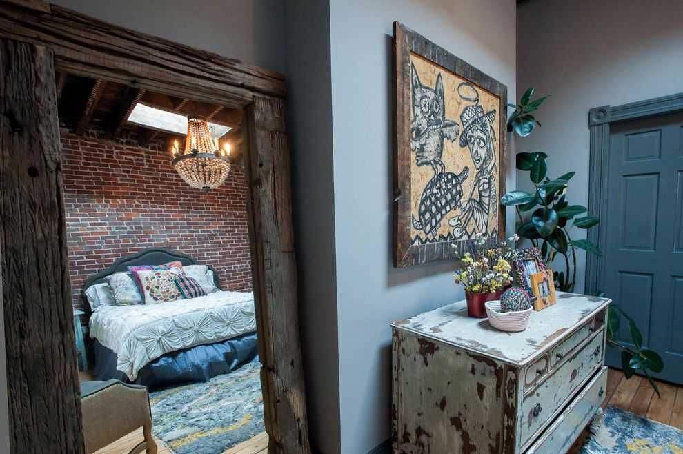 Деревянный комод с потертыми поверхностями в спальне эклектичного стиля
