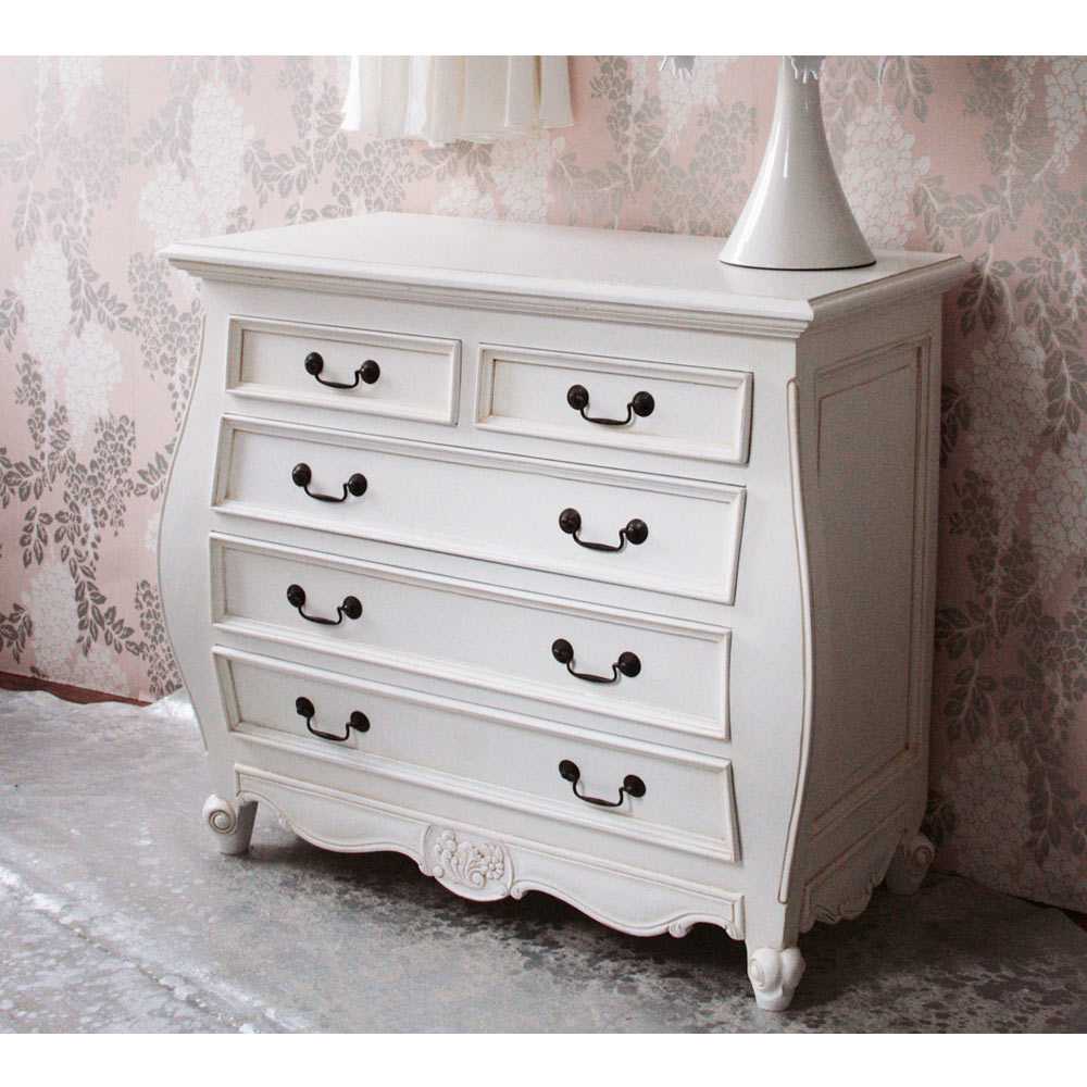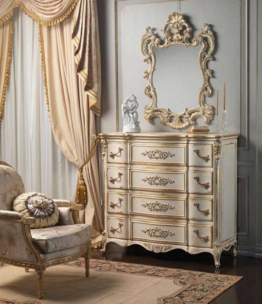 Для мебели в данном стиле характерны растительные узоры. Интерьер комнаты выполнен в нейтральных тонах. Комод, как правило, белого цвета с состаренной деревянной поверхностью. Все должно быть оформлено так, чтобы помещение выглядело просторным и светлым. В качестве дополнительного декора можно украсить спальню панно и шторами с узорами в виде цветов.
