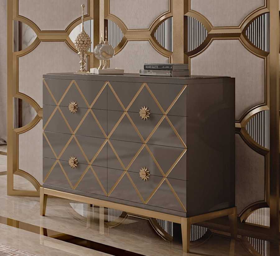 Деревянный комод с резьбой и золотистым декором станет достойным элементом интерьера спальни в стиле классика