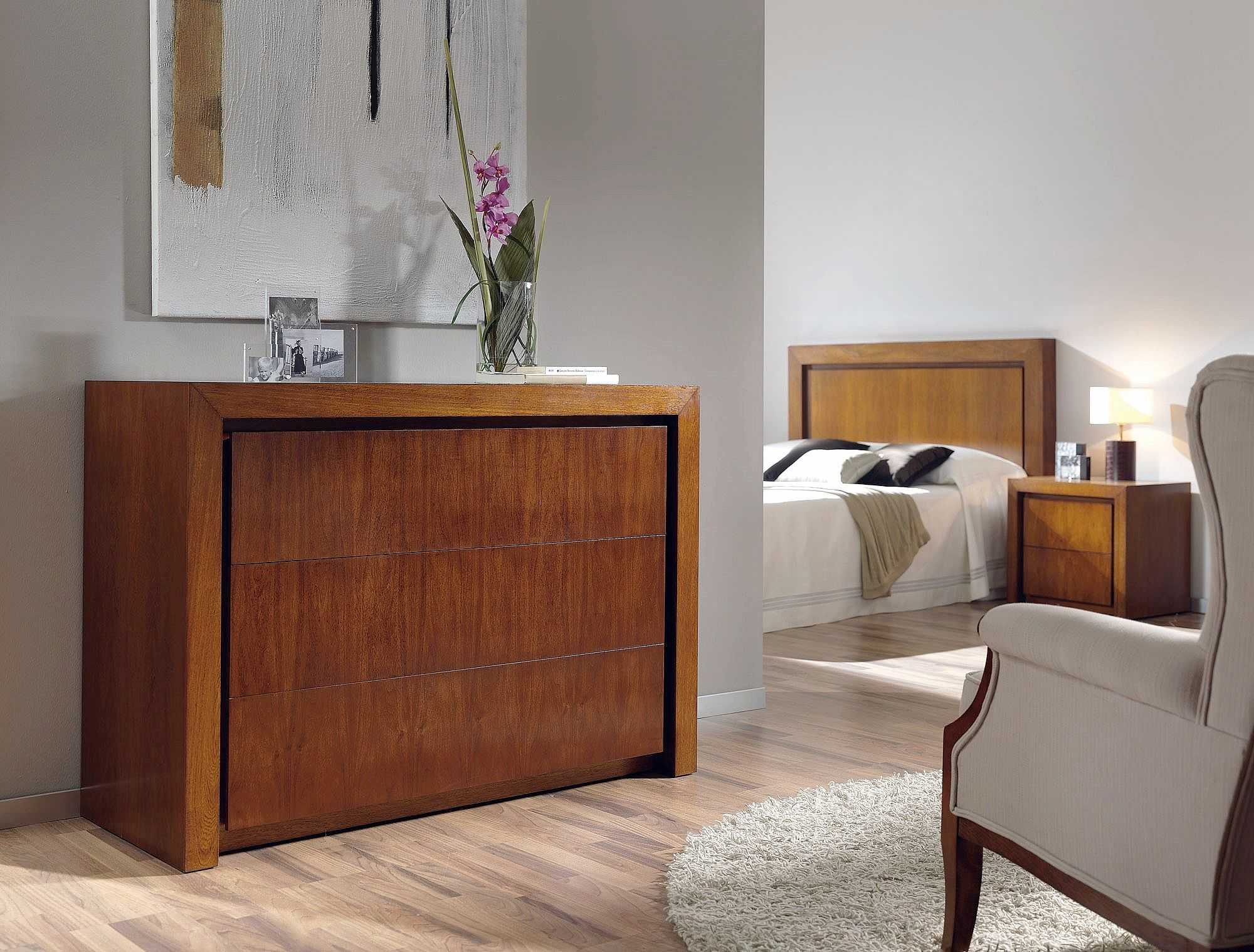 Стиль характеризуется изысканностью и изящностью, привносит в спальню ощущение роскоши, комфорта и уюта. Более всего актуален в просторных спальнях. Для маленьких комнат подходит не очень. Тона либо светлые, либо контрастно-темные. Материалы натуральные. Комод в указанном стиле имеет простые линии и сдержанное декорирование дерева либо резьбу, сложные формы, плюс наличие декоративных накладок.