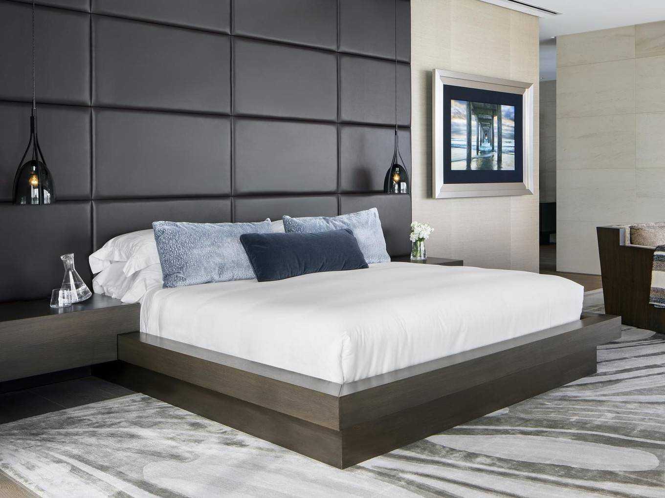 Исключение — изголовье из снежно-белой идеально выделанной кожи. Оно требует максимально лаконичного соседства, а потому тумбы здесь должны быть с простыми светлыми фасадами.