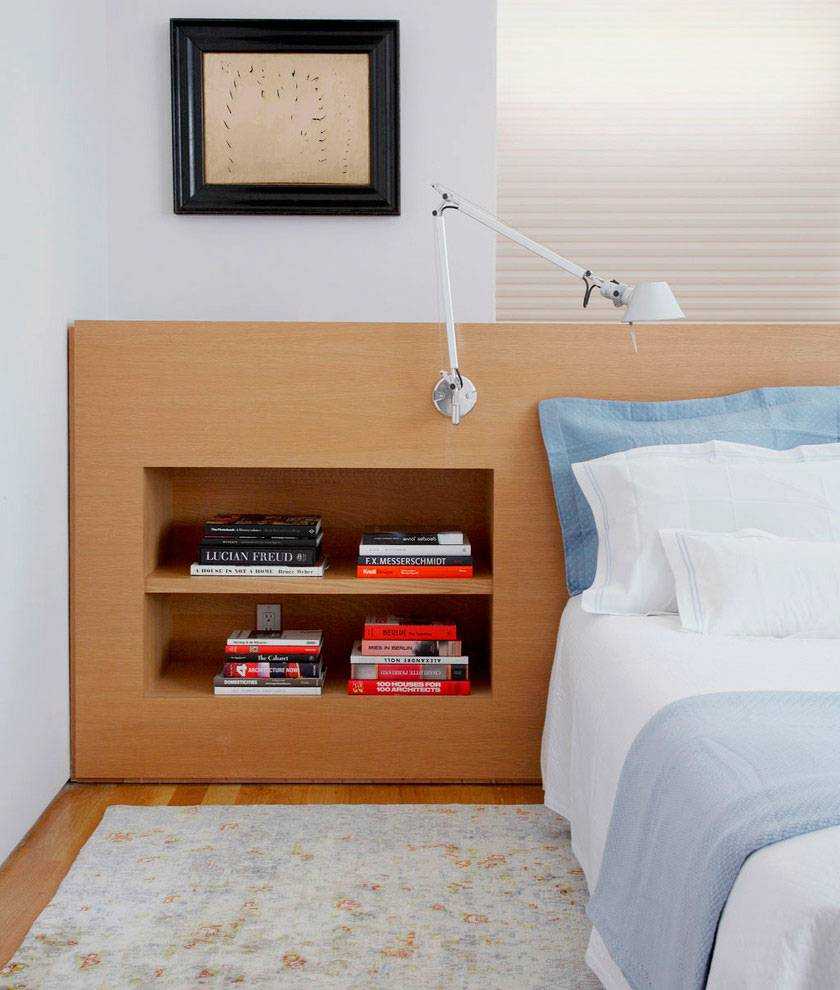 На жесткой и высокой стенке можно оформить полочки или подставки. Это идеально для маленькой спальни, в которой не поместятся прикроватные тумбочки. На этих полочках размещайте ночники, книги или вазы.