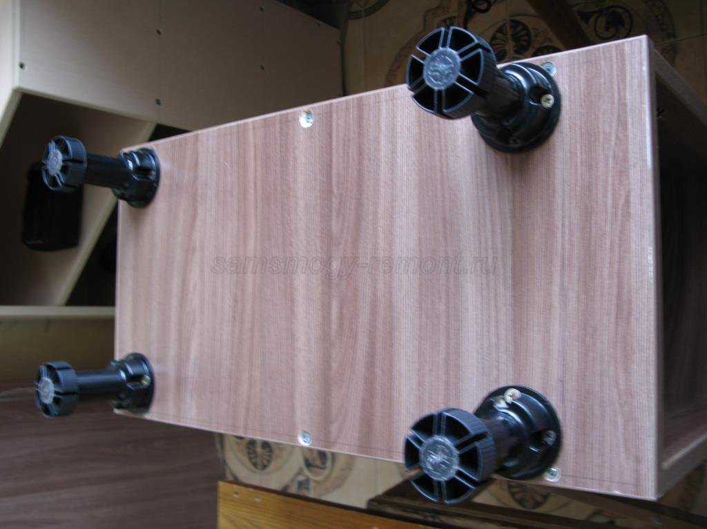 Все тумбы собраны по принципу накладного дна, то есть боковины стоят на основании. Каждая тумба установлена на 4 регулируемые опоры (под мойку — 6 штук), в последствии закрывающихся цоколем. Чтобы не упираться ногами подойдя к рабочей зоне кухни, цоколь утоплен вглубь.