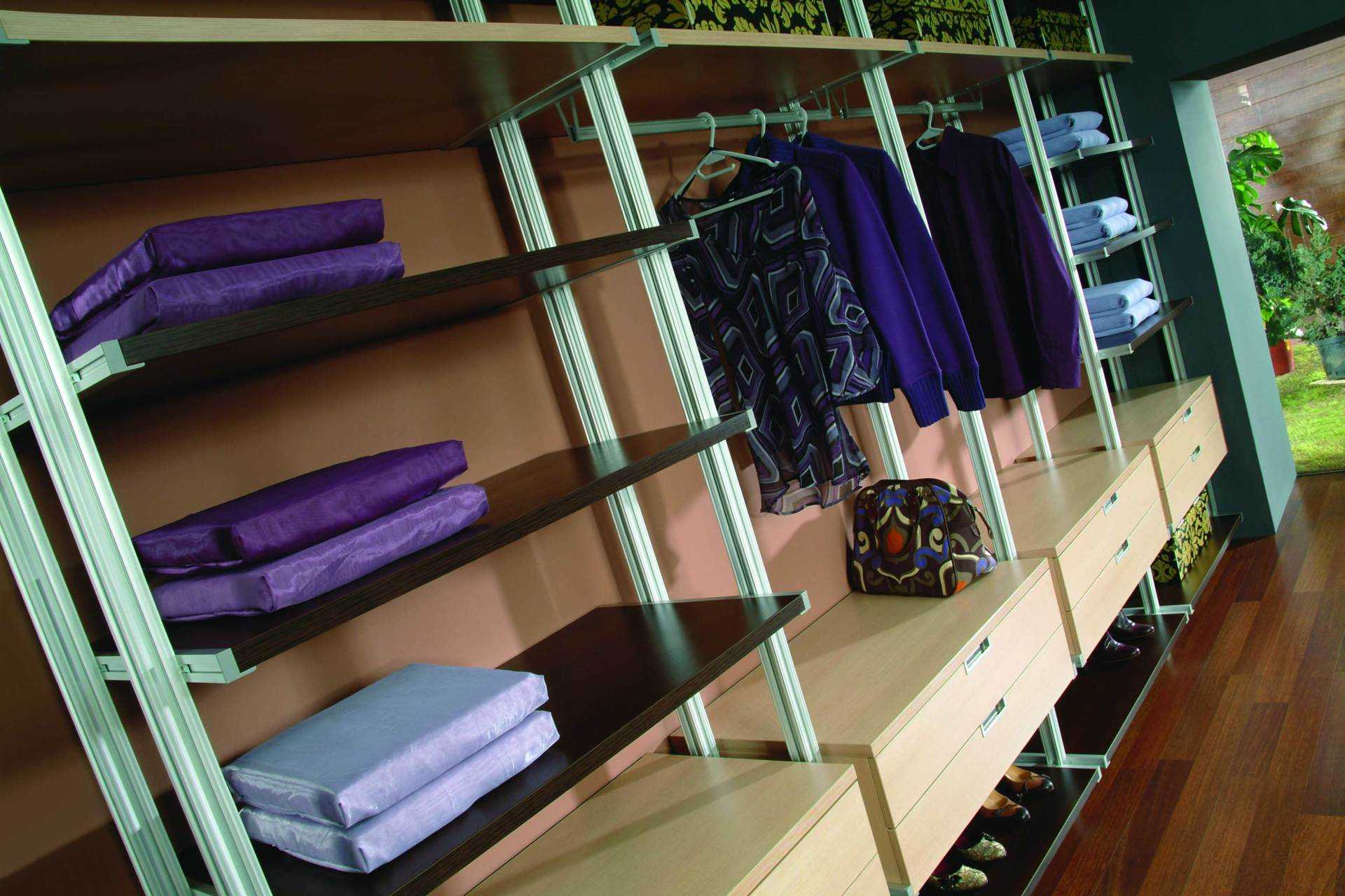 Железный каркас может быть одноуровневым или двухуровневым. Колонные системы удобны для организации зонирования гардеробной, с их помощью можно удачно делить пространство. Минусы – отсутствие ограничений на стеллажах. Открытый тип полок не убережет сложенную стопкой одежду от падения.