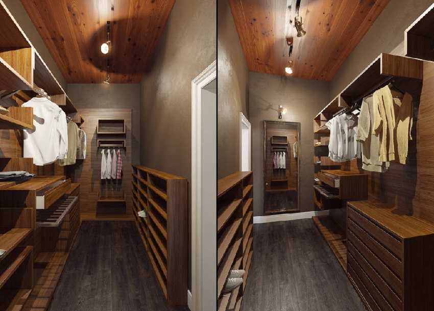 Для узких пространств подойдет угловая гардеробная в спальне. Фото дизайнов подбирают согласно общего оформления.