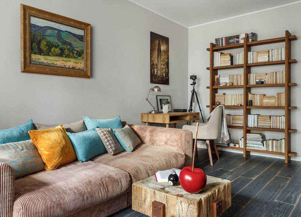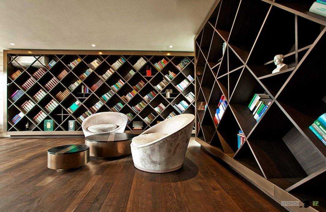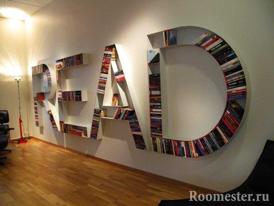 Классический вариант с книжными полками используется в интерьере многих современных комнат для гостей. В большинстве домов книги хранятся либо в советских стенках, либо в обыкновенных книжных шкафах. Однако сегодня дизайнеры рекомендуют размещать книги на навесных полках, которые могут быть металлическими или деревянными. Иногда используются комбинированные полки, состоящие из обоих материалов. Чтобы придать интерьеру изюминку, дизайнеры разрабатывают необычные формы для книжных полок. К примеру, они могут располагаться под углом или в виде нескольких крестовин.