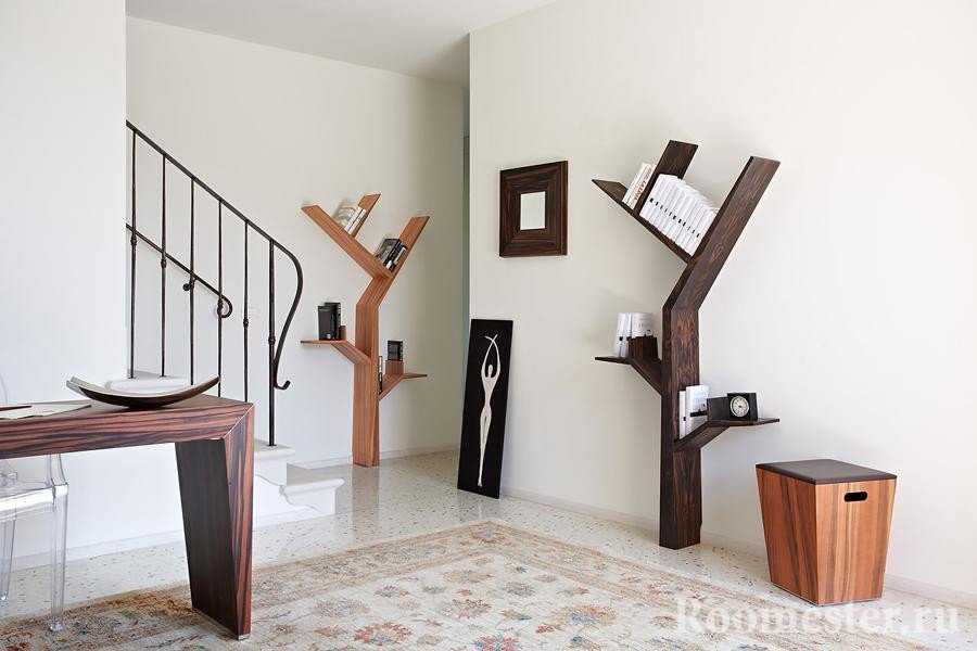 - Деревянные. Модели из натуральной древесины или досок, являются классическим решением, которое всегда имеет очень красивый и аутентичный внешний вид. Дерево прекрасно комбинируется со стеклом или металлом и подходит для изготовления резных полок или стеллажей с любой конфигурацией