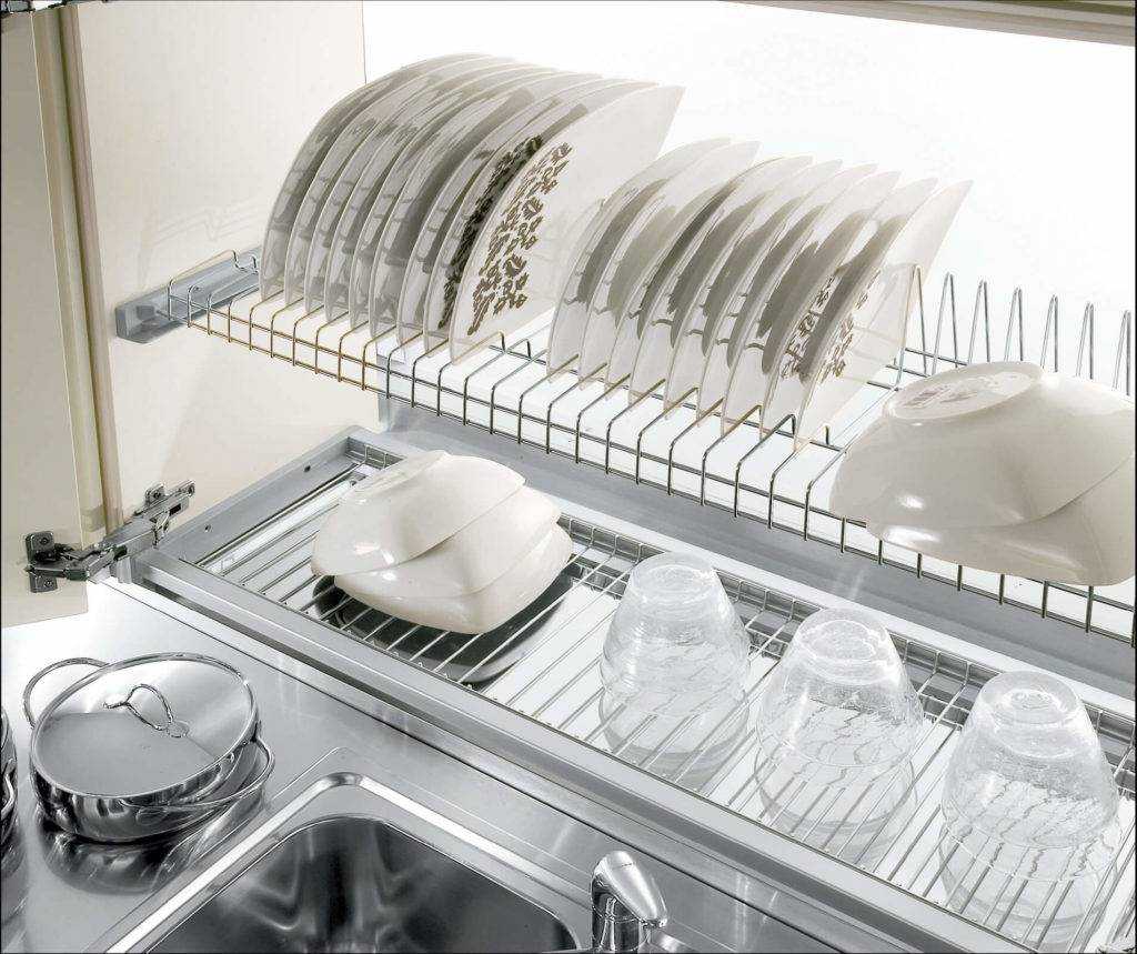 Неотъемлемой частью кухонного гарнитура является шкаф для посуды, оснащенный сушилкой. Шкафы-сушилки навешивают над мойкой либо вблизи ее. Сушилка представляет собой комплект из решетчатой полки и поддона для сбора капель воды. Решетчатая конструкция изготавливается из пластика, алюминия, нержавеющей либо хромированной стали.